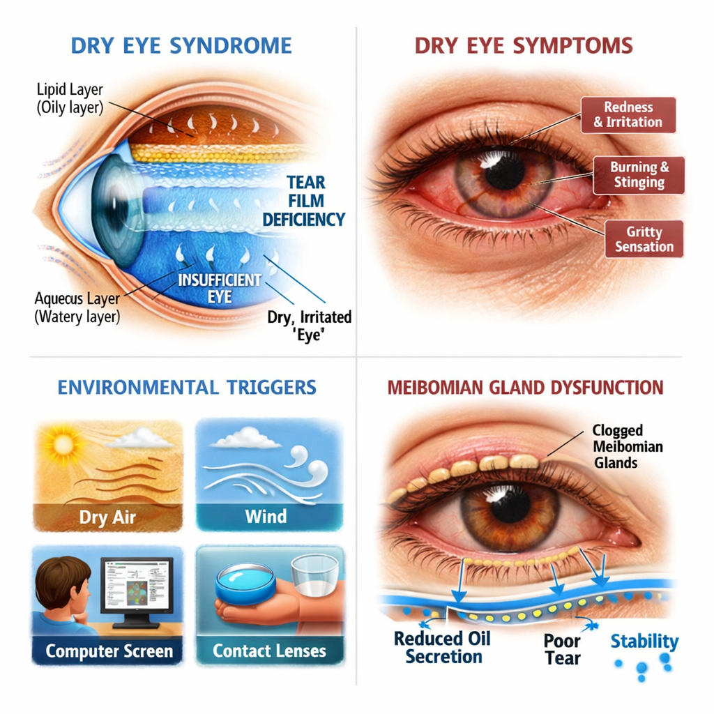 • Fluctuating or reduced vision: An unstable tear film causes blurred, inconsistent vision that can interfere with reading, driving, and screen use.